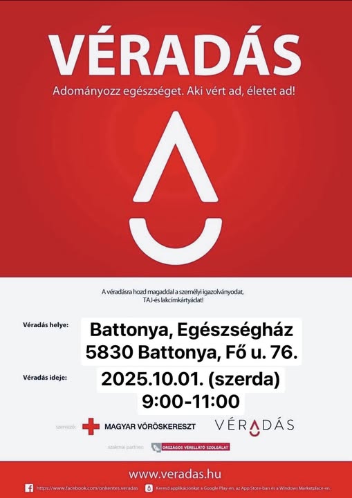 You are here: Home › Battonyai hírek › Véradás Battonyán ← Új bölcsőde Teltház → Véradás Battonyán Szerdán, október 1-jén 9.00-11.00 óra között véradási akció lesz Battonyán az Egészségházban: Fő utca 76. Vélemény, hozzászólás? Kilépés a válaszbólAz email címet nem tesszük közzé. A kötelező mezőket * karakterrel jelöltükHozzászólás Név * E-mail cím * Honlap A nevem, email címem, és weboldalcímem mentése a böngészőben a következő hozzászólásomhoz.