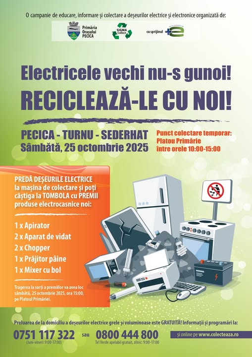 Szombaton, október 25-án, 10 és 15 óra között várják Pécska és a hozzá tartozó falvak lakosait, hogy a városháza előtt leadják régi vagy meghibásodott elektromos készülékeiket. Akinek nagyobb mennyiségű vagy nehéz elektromos hulladéka van, ma és holnap 9-16 óra között igényelheti az ingyenes elszállítást, a 0751.117.322-es telefonszámon, az ingyenes 0800.444.800-as zöldszámon, vagy a a www.colecteaza.ro weboldalon. Az érintettek automatikusan résztvesznek a nyereményjátékon. A sorsolás ugyancsak szombaton, 15 órakor lesz a városháza előtt. A nyeremények a következők: egy porszívó, 2 vákuumcsomagoló, 2 elektromos aprító, egy kenyérpirító és egy tálas mixer.