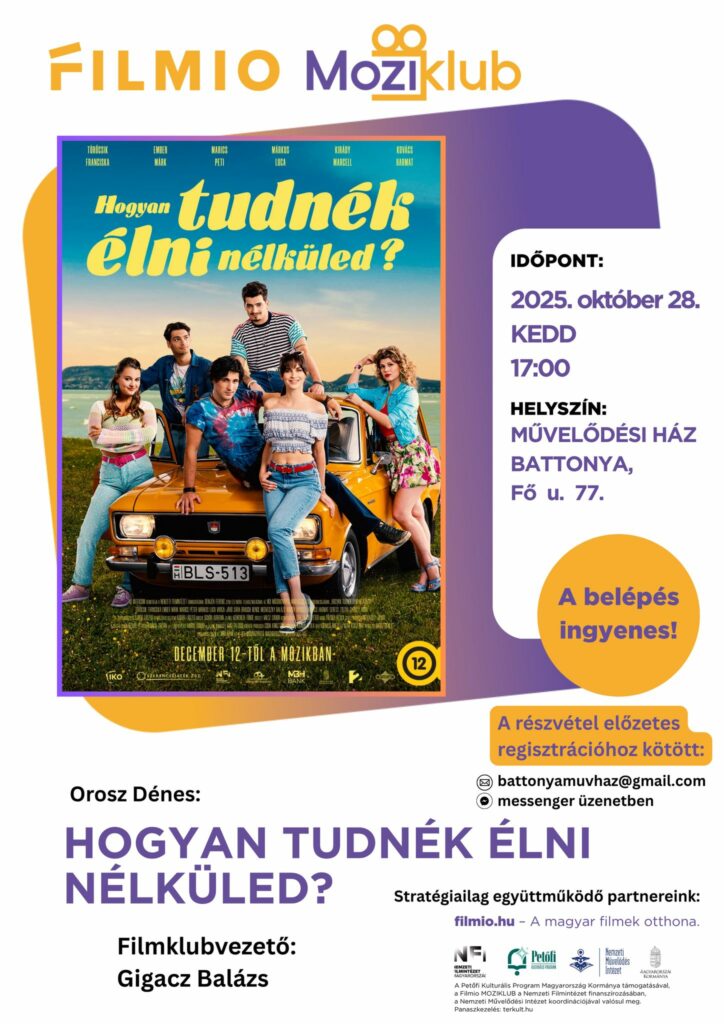 You are here: Home › Battonyai hírek › Filmvetítés Battonyán ← Elektromos készülékek újrahasznosítása Filmvetítés Battonyán Október 28-án Battonyán a művelődési házban 17.00 órától a Filmio Moziklub vetíti a “Hogyan tudnék élni nélkülde” című filmet. A belépés ingyenes, de regisztrációhoz kötött a battonyamuvhaz@gmail.com email-címen. Vélemény, hozzászólás? Kilépés a válaszbólAz email címet nem tesszük közzé. A kötelező mezőket * karakterrel jelöltükHozzászólás Név * E-mail cím * Honlap A nevem, email címem, és weboldalcímem mentése a böngészőben a következő hozzászólásomhoz.