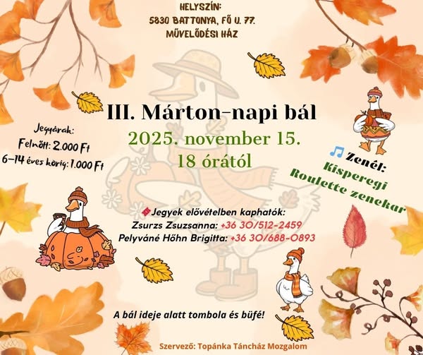 Harmadik alkalommal szervezik meg Battonyán november 15-én 18.00 órától a hagyományos Márton-napi bálat a helyi művelődési házban. A belépő felnőtteknek 2000 forint, gyerekeknek 1000 forint. Zenél a kisperegi Roulette.
