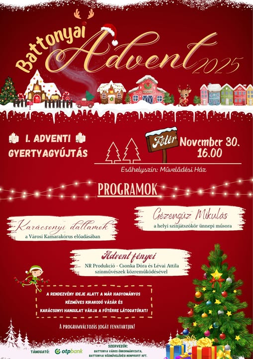 You are here: Home › Battonyai hírek › Battonyai Advent ← Expo Tarantula Pécskán Battonyai Advent A Battonyai Művelődési Ház vasárnap, november 30-án szervezi a Főtéren 16.00 órától az I. adventi gyertyagyújtást amelyre szeretettel várnak minden helybeli lakost. A program: Vélemény, hozzászólás? Kilépés a válaszbólAz email címet nem tesszük közzé. A kötelező mezőket * karakterrel jelöltükHozzászólás Név * E-mail cím * Honlap A nevem, email címem, és weboldalcímem mentése a böngészőben a következő hozzászólásomhoz.